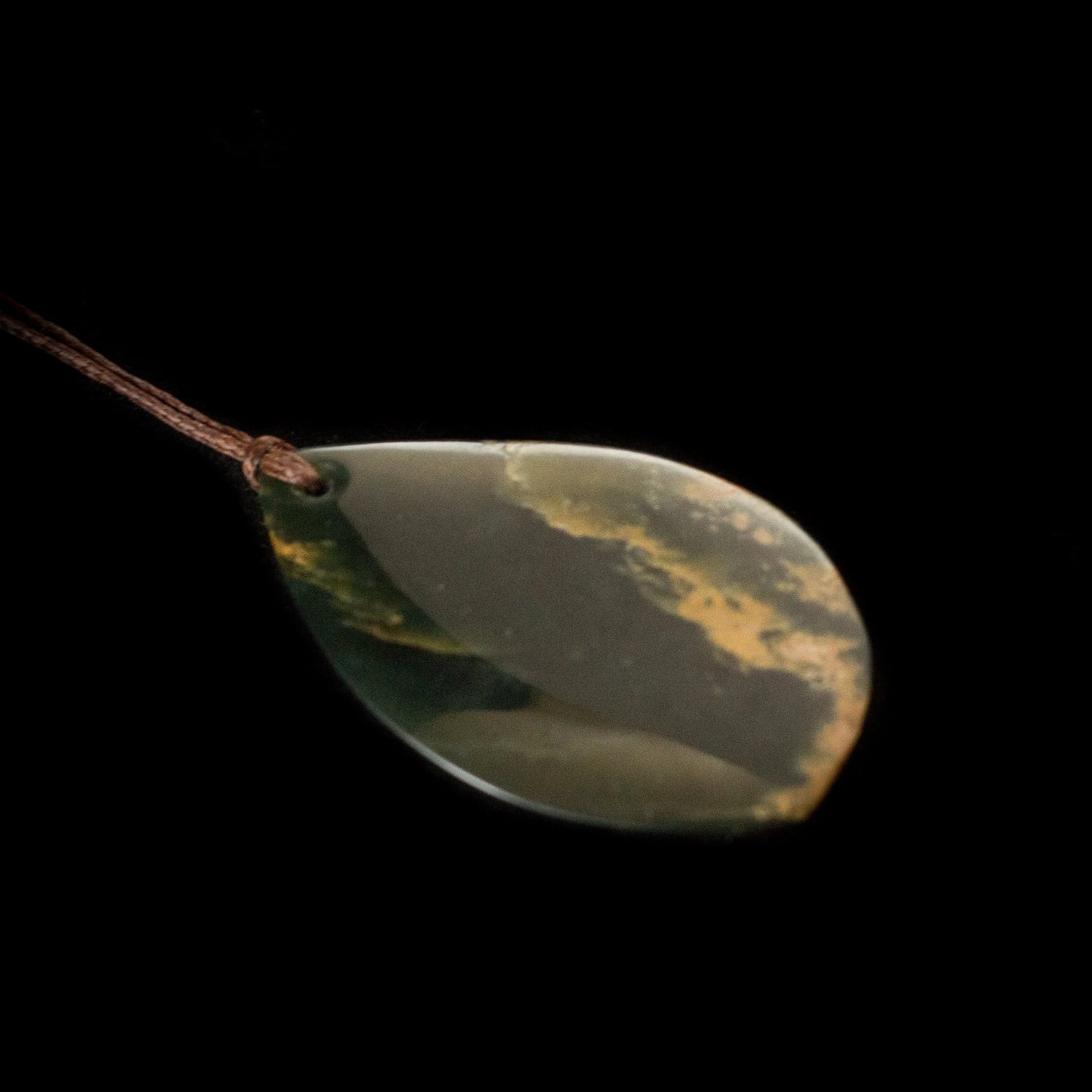 The stone displays natural golden and green movement, with organic patterning that gives the piece warmth and individuality. Grounded yet expressive, this roimata is made to be worn close or gifted with intention.