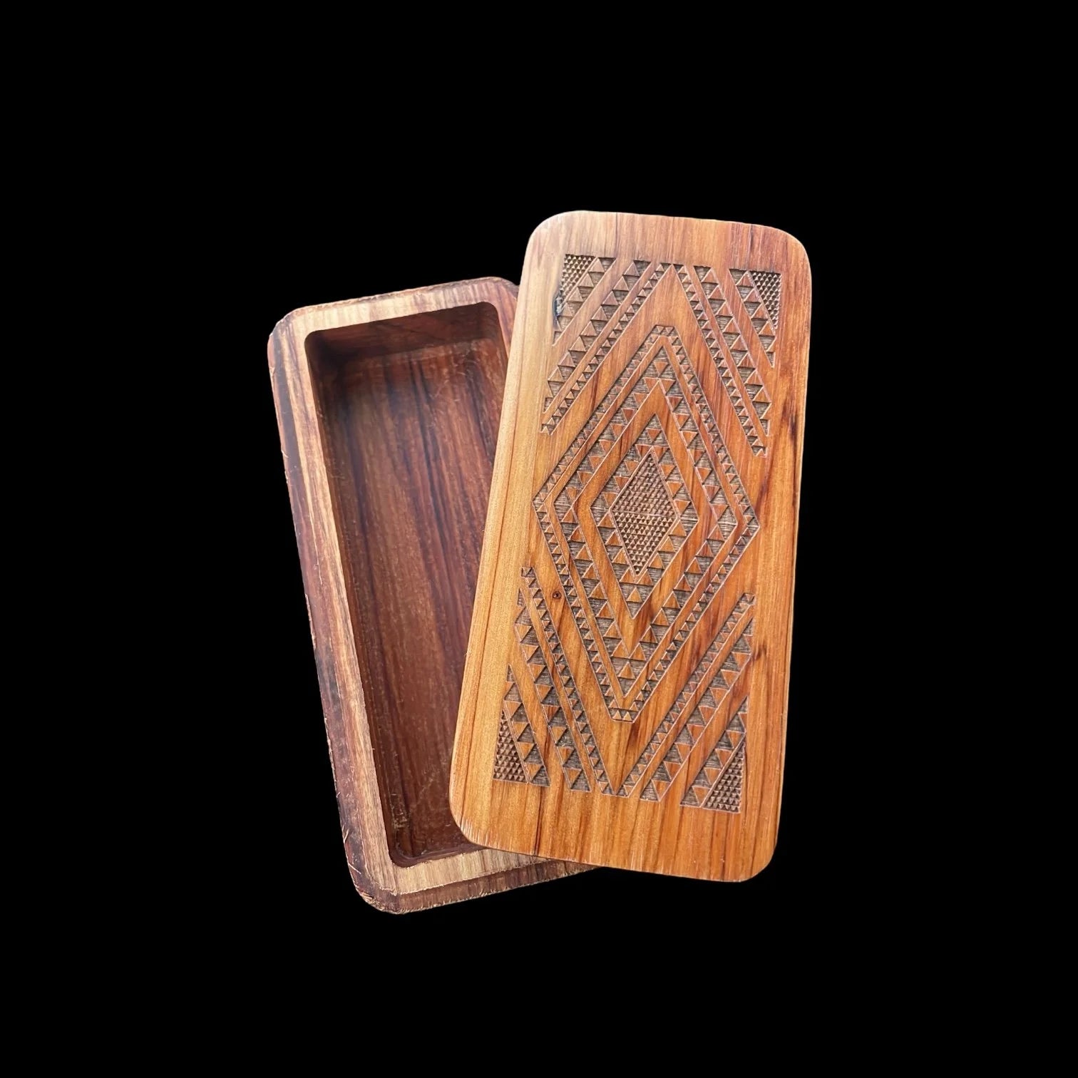 This handcrafted mātai gift box features a carved tāniko-inspired pattern, drawing on traditional Māori weaving forms that speak to balance, strength, and whakapapa. The design is deliberate and rhythmic, creating depth and movement across the lid while keeping a clean, timeless feel.